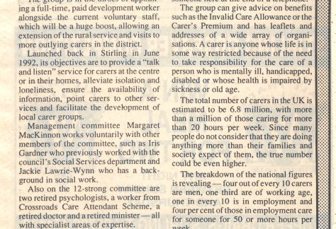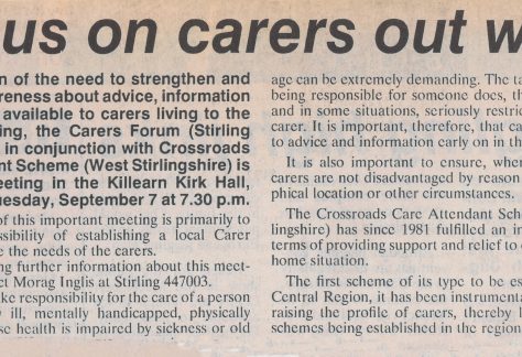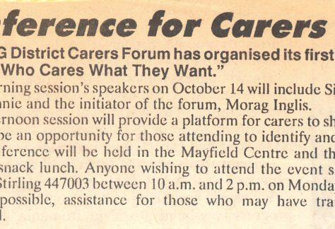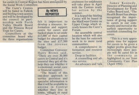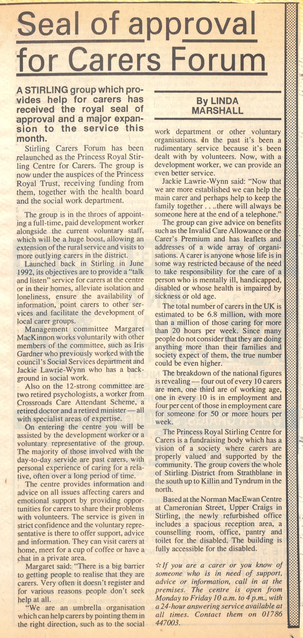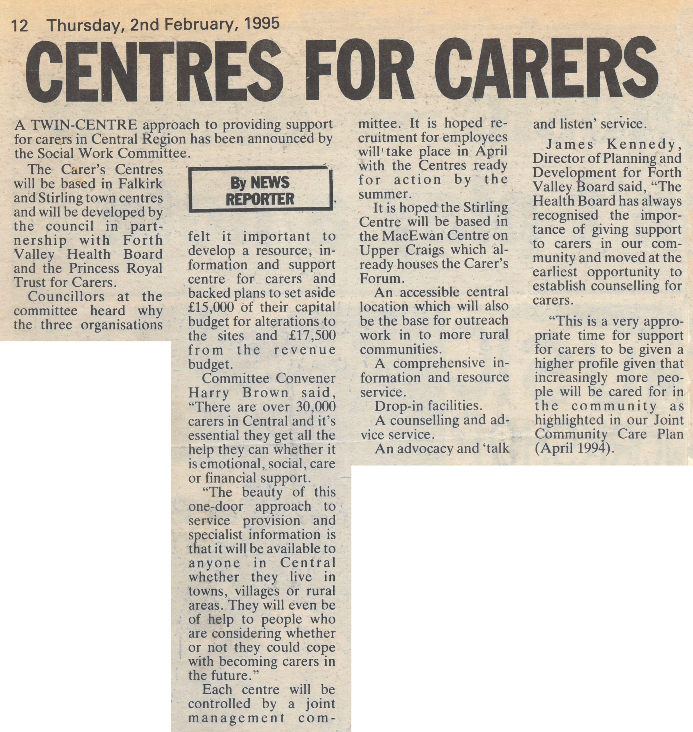 Stirling District Carers Forum was formed in 1992 by a group of local professionals and Carers who felt there should be more support available for people who found themselves in a caring role. The voluntary group operated a drop in 3 days a week at the Norman MacEwan Centre, with an annual budget of £3000.