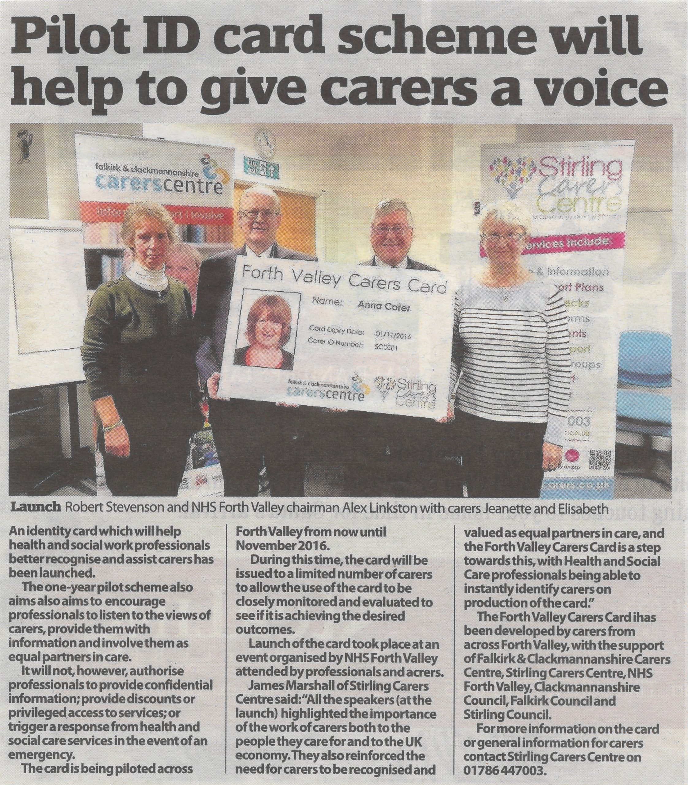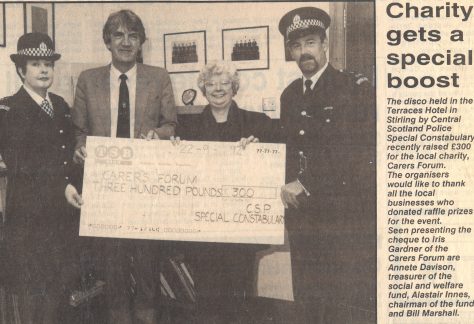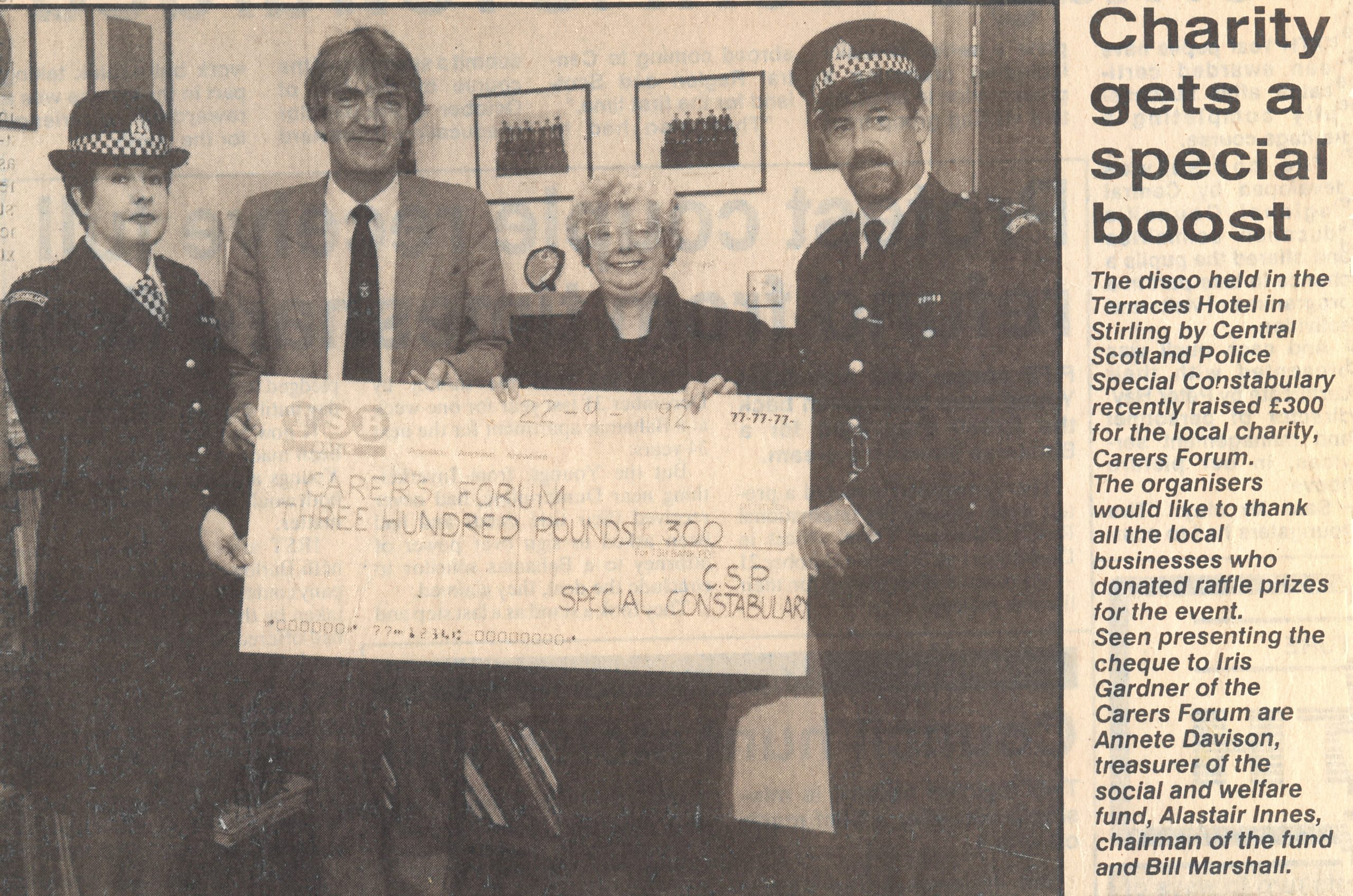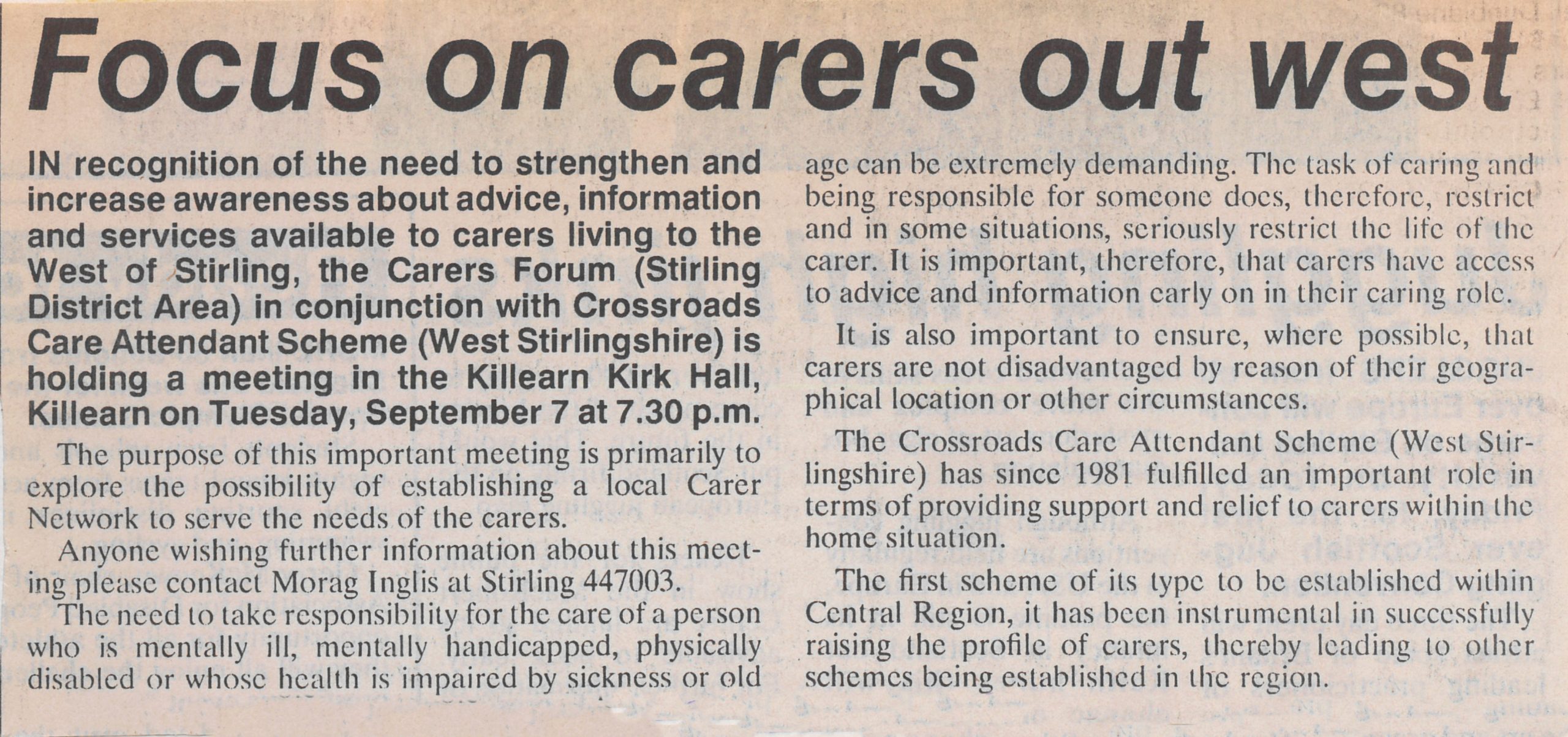 Stirling District Carers Forum was formed in 1992 by a group of local professionals and Carers who felt there should be more support available for people who found themselves in a caring role. The voluntary group operated a drop in 3 days a week at the Norman MacEwan Centre, with an annual budget of £3000.