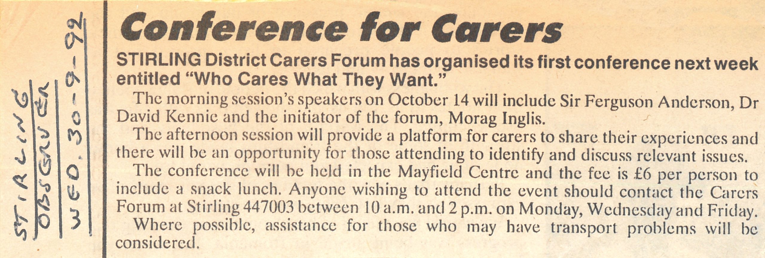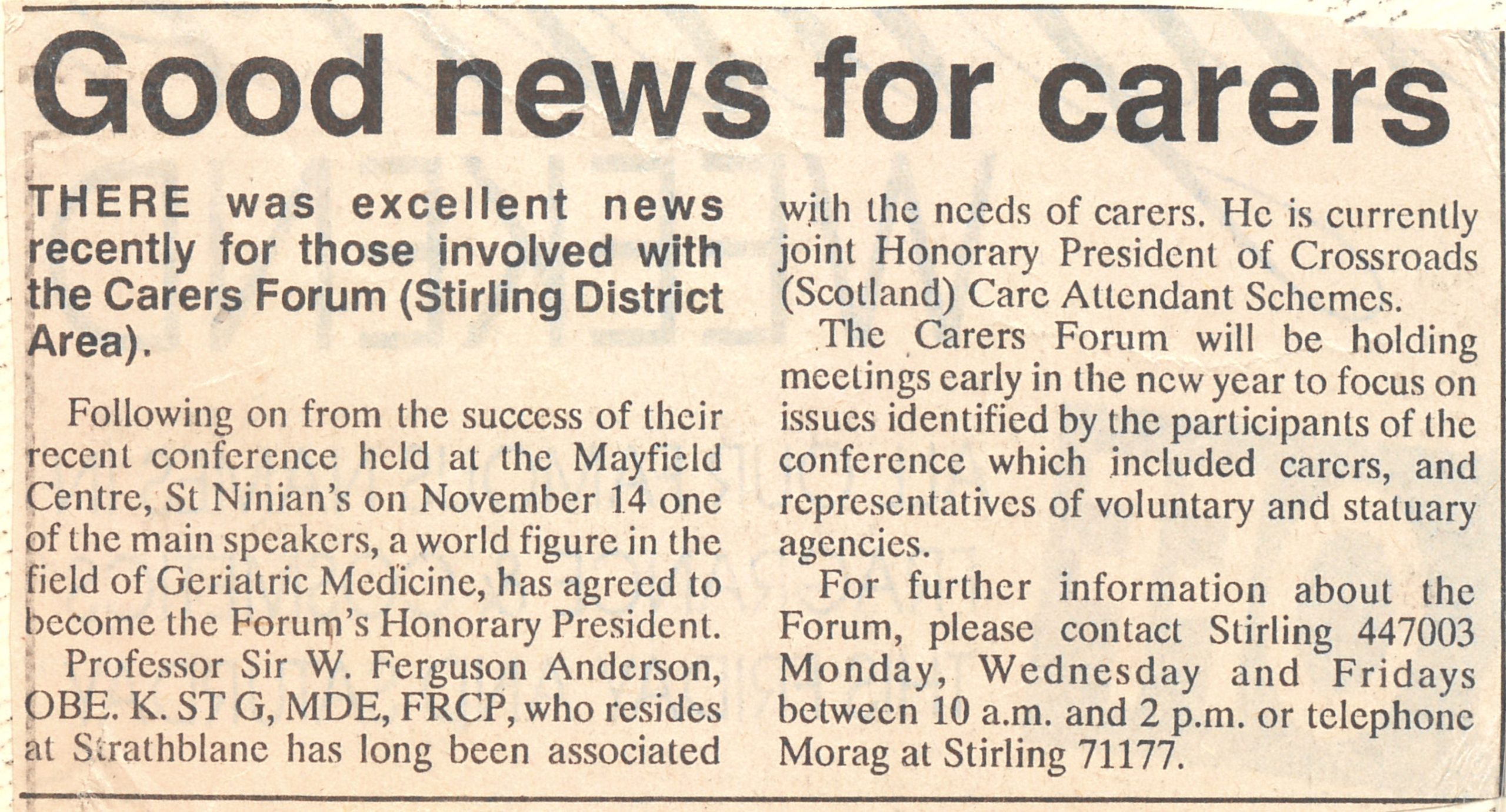 On 14th October 1992 the first ‘Carers Conference’ was held in Stirling, with Sir Ferguson Anderson, the world’s first Professor of Geriatric Medicine and an advocate of Carers’ needs, as the key speaker. He was clearly impressed with the group’s work, as a month later he accepted the role of Honorary President.